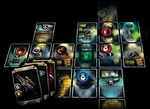 Le jeu vous propose donc un paquet de cartes qui servent de tuiles pour former l'aire de jeu. Certaines des pièces vous permettent d'y chercher des objets, d'autres font apparaitre des monstres, des portes à code (qu'il faudra trouver), etc etc.
